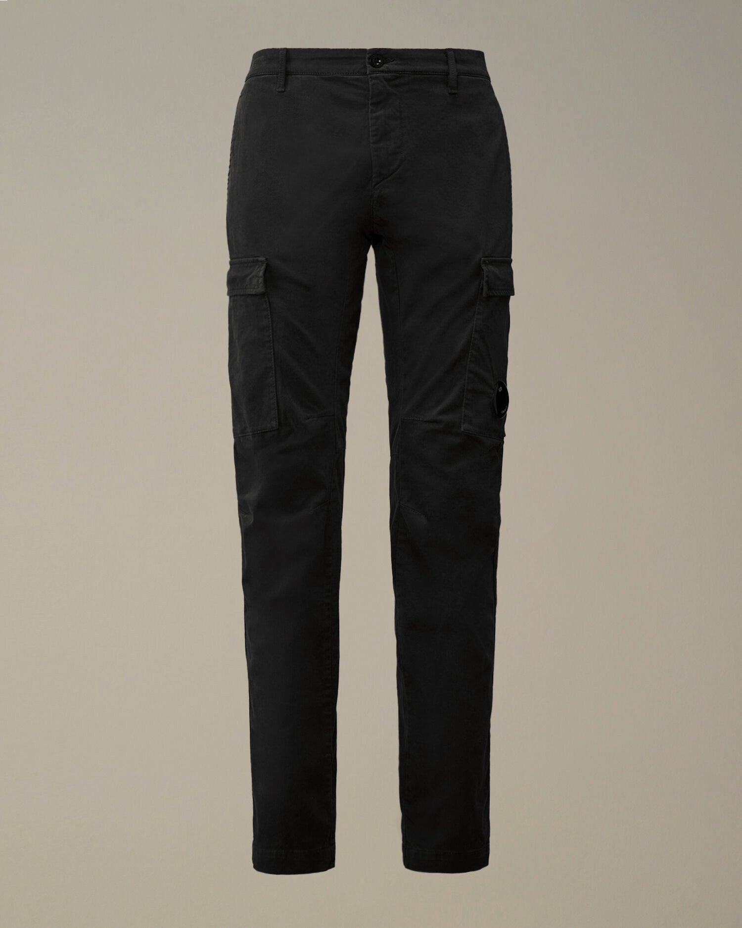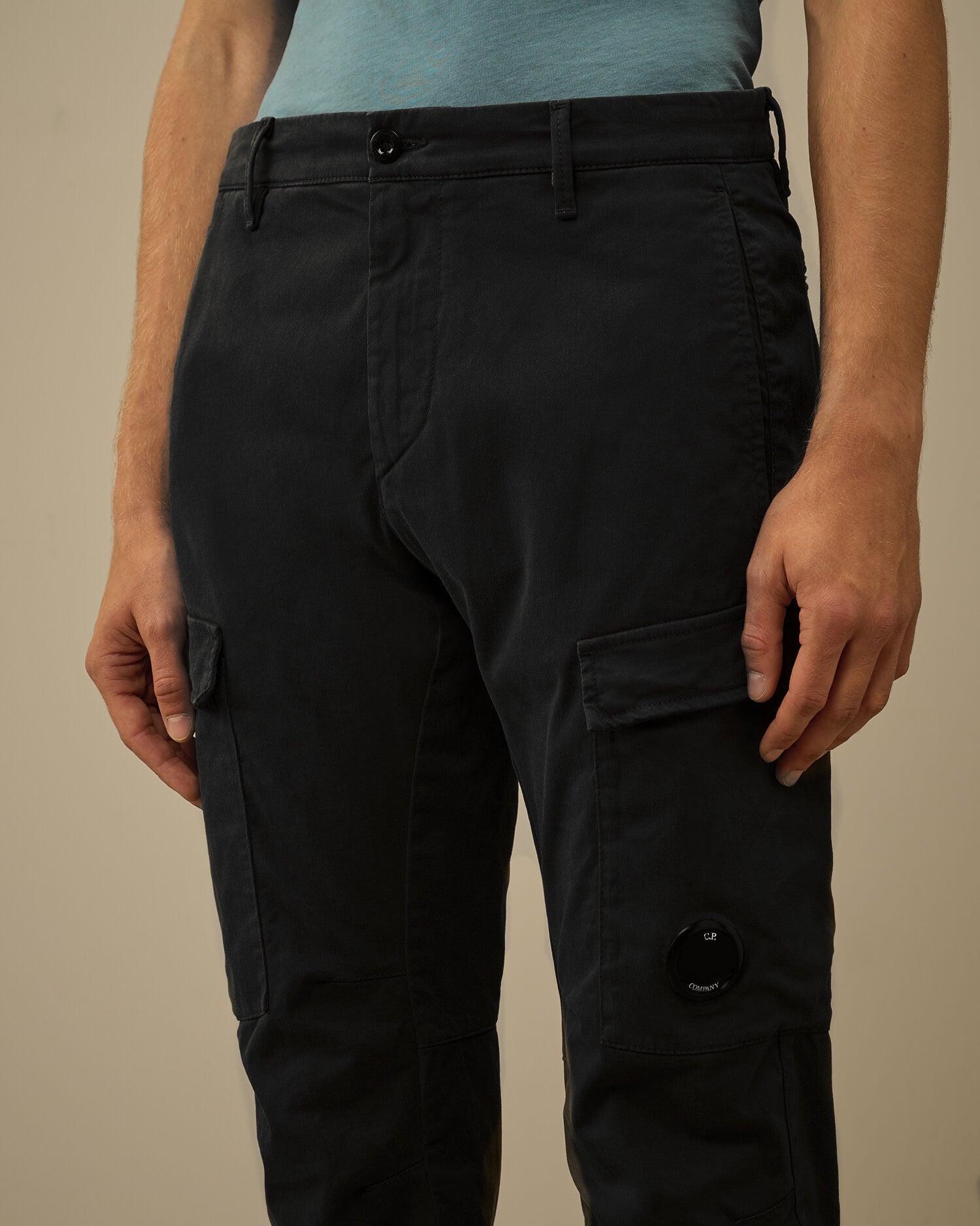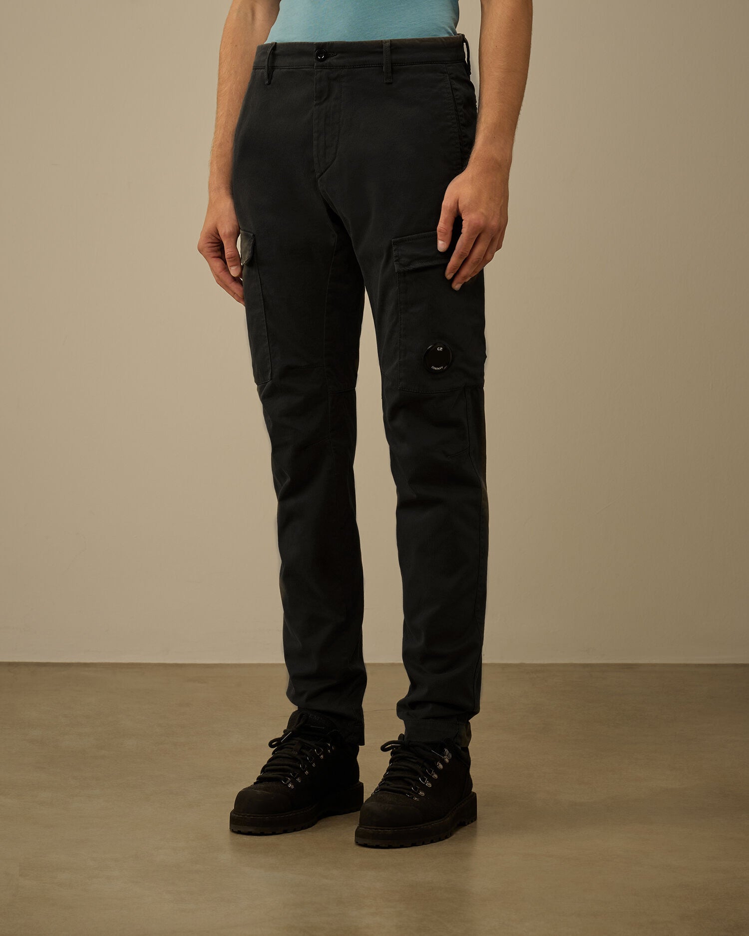 Pantaloni cargo realizzati in raso di cotone stretch smerigliato. ll capo presenta l'iconica Lente di C.P. Company, chiusura con bottone e zip, passanti per la cintura, tasche laterali e tasche cargo con patta e bottoni automatici. Rifiniti da tasche posteriori a filetto con etichetta applicata. Tinti in capo. Ergonomic fit.