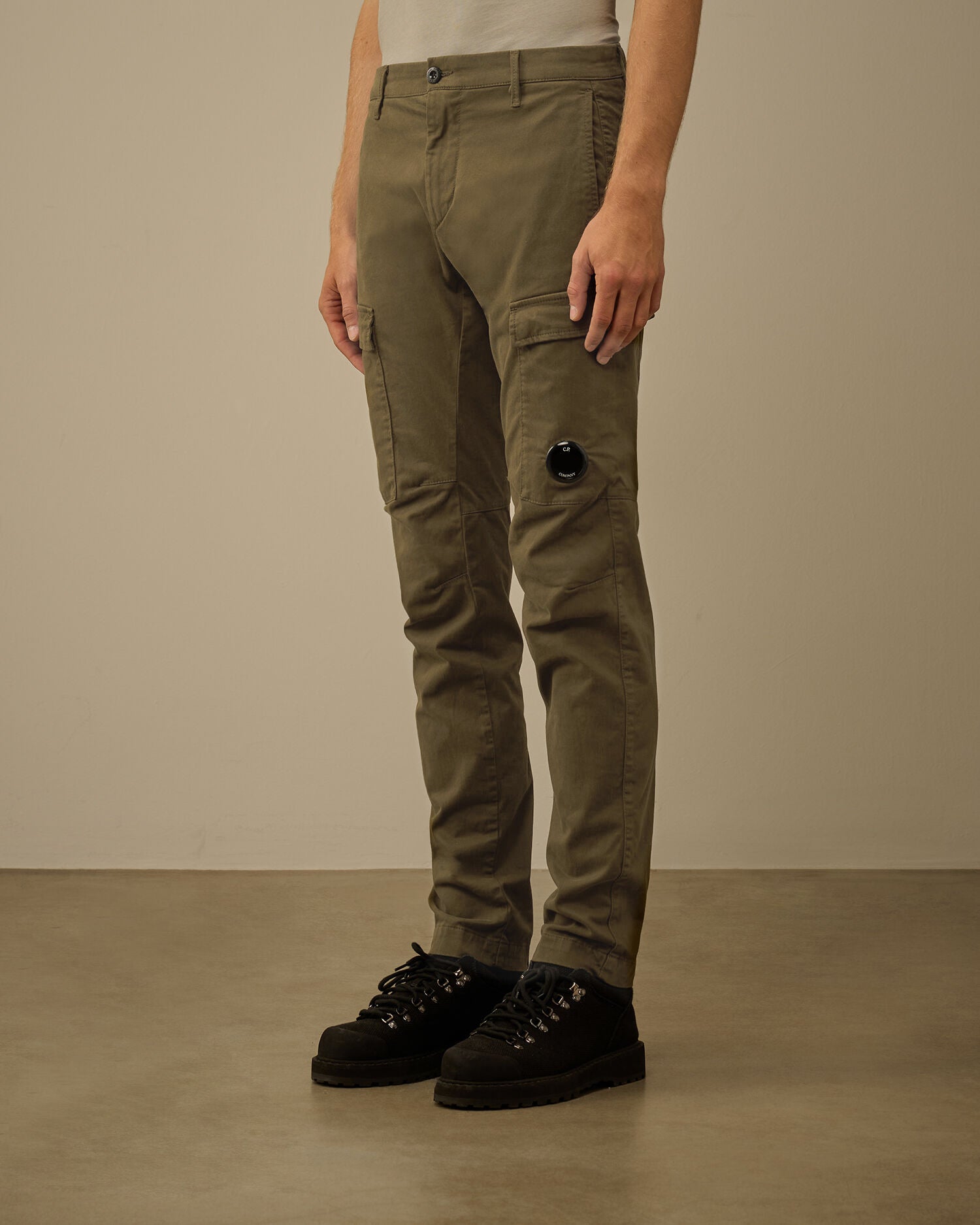 Pantaloni cargo realizzati in raso di cotone stretch smerigliato. ll capo presenta l'iconica Lente di C.P. Company, chiusura con bottone e zip, passanti per la cintura, tasche laterali e tasche cargo con patta e bottoni automatici. Rifiniti da tasche posteriori a filetto con etichetta applicata. Tinti in capo. Ergonomic fit.