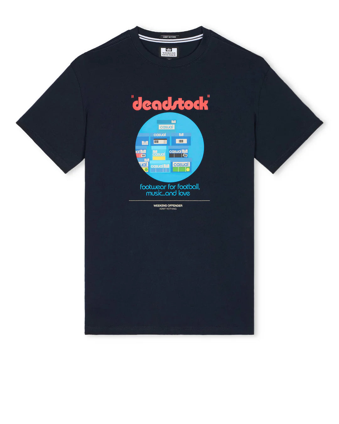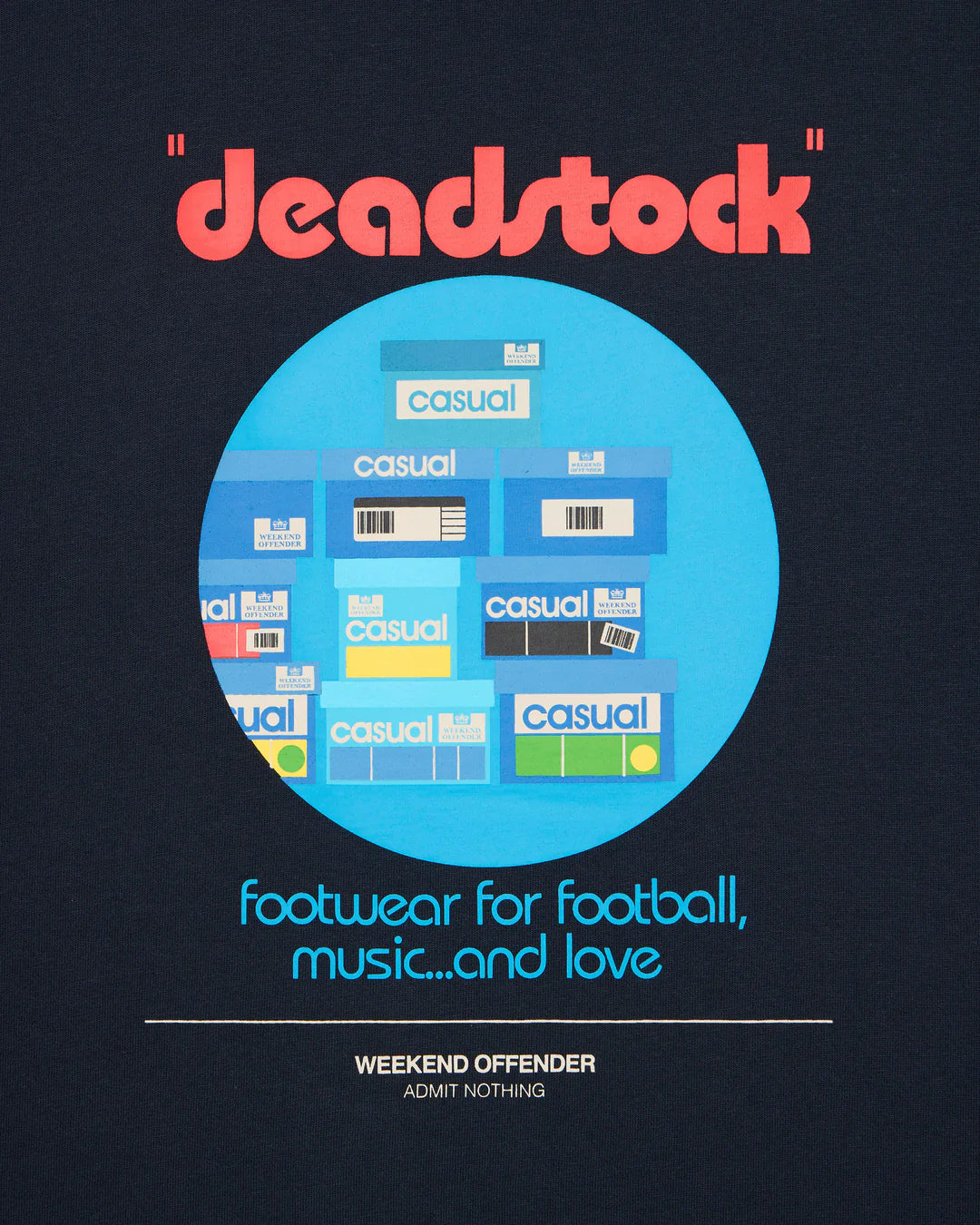 La maglietta grafica Deadstock presenta un'illustrazione ispirata all'iconico poster del film Woodstock, creativamente reinterpretata per leggere "deadstock", con riferimento a rare scarpe da ginnastica da collezione. Questo tocco giocoso unisce lo spirito del leggendario festival musicale con la vivace cultura del collezionismo di scarpe da ginnastica, celebrando lo stile unico e il significato di calzature ricercate.