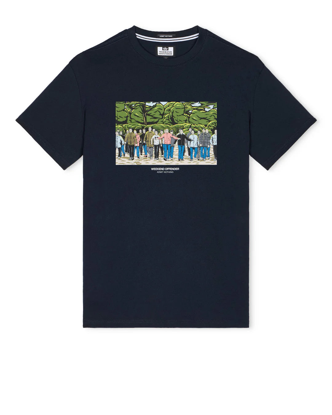 La maglietta grafica GSE raffigura un'iconica scena di combattimento tra società di football rivisitata con i partecipanti vestiti da Weekend Offender.